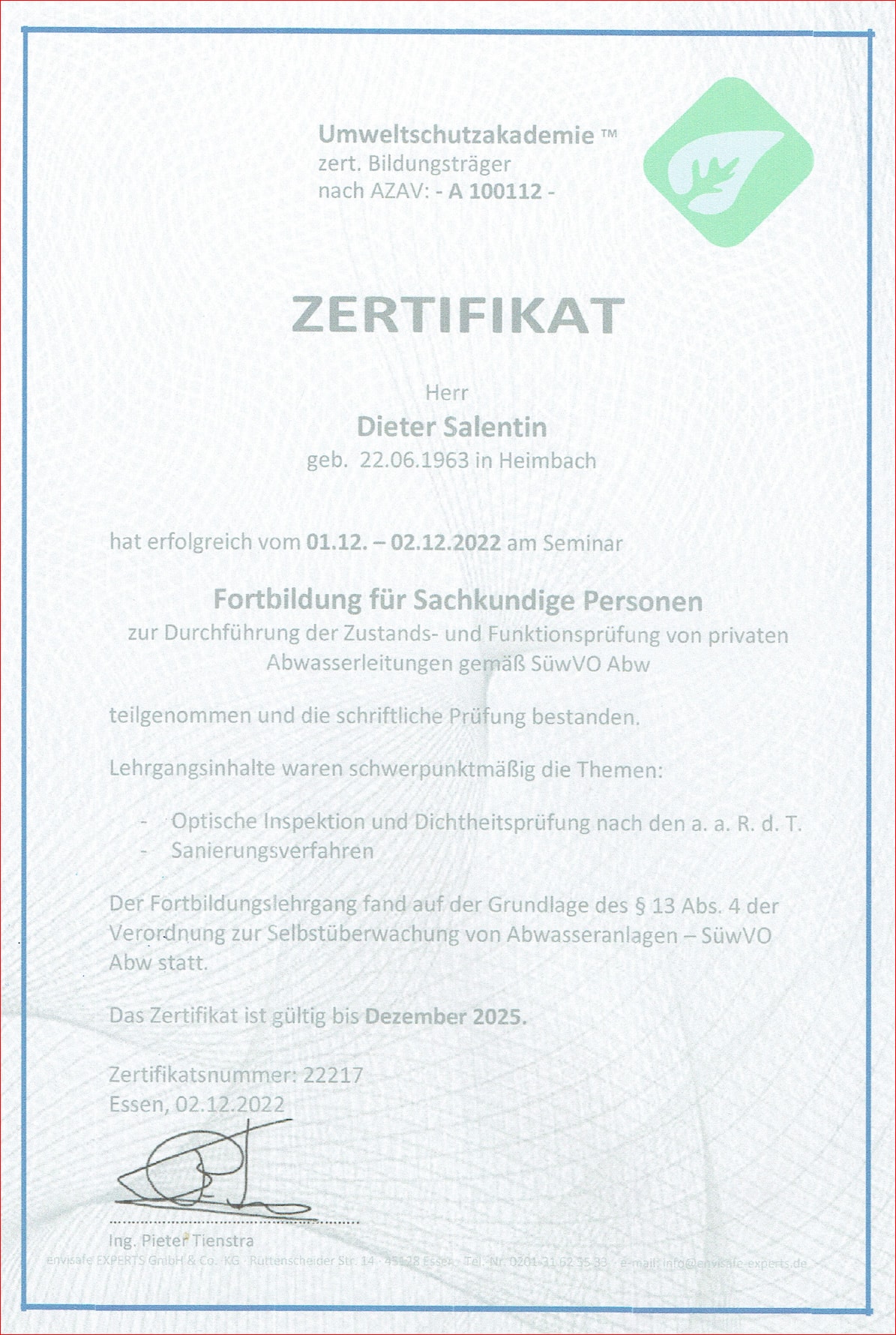 Unser Unternehmen darf Ihnen als zertifizierter Fachbetrieb die notwendigen Prüfunterlagen ausstellen und per Unterschrift für Ihr Haus bzw. Objekt die Dichtigkeit Ihrer Leitungen bescheinigen. Diese Bescheinigung ist dann Ihrer Kommune vorzulegen. Die Dichtigkeitsprüfung ist spätestens nach 20 Jahren zu wiederholen, es sei denn, die Grundleitung wird verändert oder erneuert.