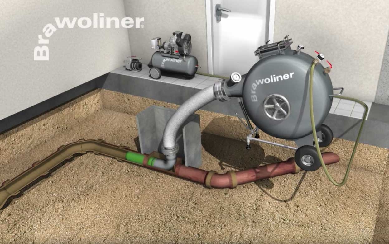Bei dem Schlauchliner Verfahren wird ein mit Kunstharz getränkter flexibler Textilschlauch per Luftdruck in das zu sanierende Rohr gedrückt. Kurven oder unterschiedliche Rohrdurchmesser sind dabei kein Hindernis. Dabei kleidet BRAWOLINER® das Rohr komplett aus und beseitigt somit alle bestehenden und potentiellen Schadensbilder.